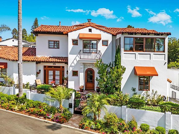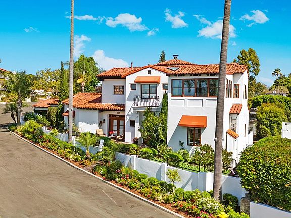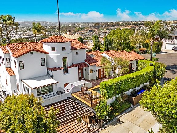 Welcome to Villa Conde, a 1931 Spanish Colonial Revival residence set on a private cul-de-sac in North Mission Hills. This home blends historic architecture with carefully considered modern design. Rooted in the heritage of one of San Diego’s most architecturally rich neighborhoods, it showcases original gumwood built-ins, beamed ceilings, hardwood floors, Venetian plaster walls, and mahogany windows. A signature Santa Barbara-style turret tower adds character and anchors the home’s striking curb appeal. Formal living and dining rooms offer elegant entertaining spaces, while the chef’s kitchen features Wolf and Sub-Zero appliances, travertine counters and a sunny breakfast nook with access to the courtyard. The bonus room, an extension of the family room, is ideal for a game room or play area. Upstairs, the primary suite features a custom walk-in closet and a peaceful sitting room with ocean and bay views. An additional upstairs room with built-in closets makes a perfect nursery or study. On the main level you will find two large rooms ideal for intergenerational living. One bedroom features an ensuite bath and is complemented by a light-filled bonus space, perfect for a home gym or studio. The front of the home, framed by palm trees, strawberry trees, and a curated herb garden create a lush, inviting entry. Along the side, a dedicated dog run caters to four-legged companions, an ideal touch for pet lovers who don’t want to compromise on design. A tranquil retreat awaits centered around a 100-year-old imported olive tree in the backyard. A plunge pool, fountain, and a bui