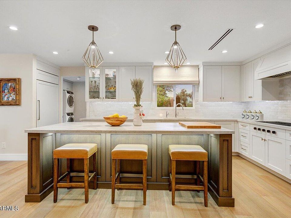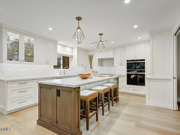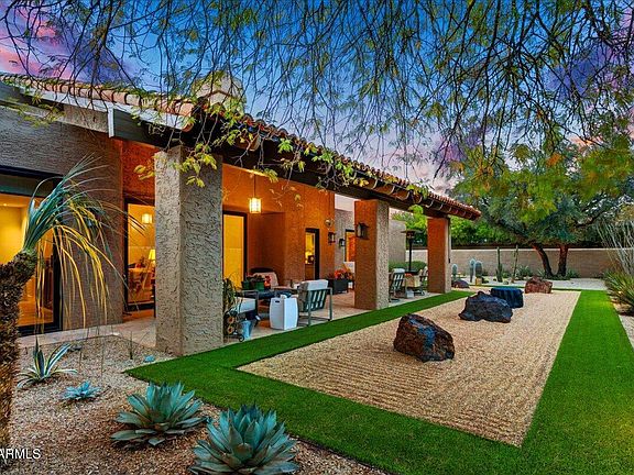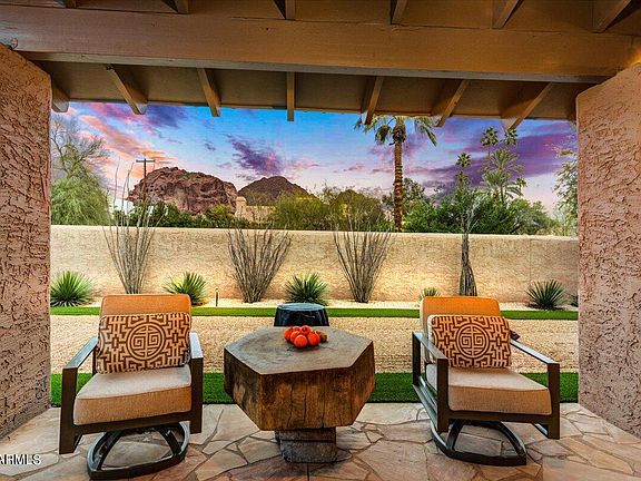 This home is perfect! Remodeled in 2022 by the owner this is a 3 bedroom, 3.5 bath home with an office or convert the office into a 4th bedroom. All of the main rooms have stunning forever Camelback views. Luxury abounds with a floor to ceiling limestone fireplace in the great room and separate family room, a limestone primary bath (heated flooring) with full wheelchair access into the bath areas. The kitchen enjoys a soft white neutral palette with a cozy breakfast area leading to the outdoors. All rooms have access to outdoor spaces with a large covered patio, fire pit and BBQ. A short distance to the airport, the location is outstanding as you can walk to the new Global Ambassador Hotel, food shopping and multiple restaurants as well as the Village Health Club. Enjoy life !!