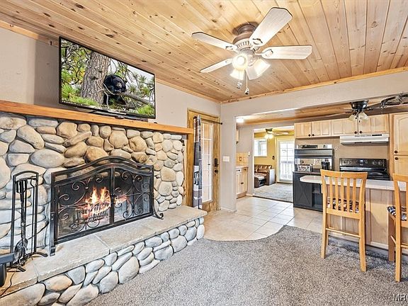 Step inside to a bright, open living area anchored by a massive rock fireplace, the kind that makes winter evenings feel extra cozy. The inviting layout flows into a functional kitchen and a comfortable bedroom, creating a space that feels bigger than expected.