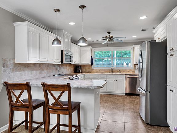 Enjoy quiet country living on .81 acre corner lot located on a dead-end street in Prairieville, LA. This stunning 3-bedroom, 2-bath W/OFFICE boasts beautiful curb appeal, NEW ROOF in 2021, and a charming front porch offering an unparalleled living experience. This residence's ambiance and timeless charm captivate with a dramatic entryway highlighted by elegant white columns that lead into a living area that provides ample room for relaxation and entertainment, complete with a cozy fireplace as the center focal point and custom built-in cabinetry for ample storage.The heart of the home is a kitchen designed for hosting family gatherings, including SS appliances, featuring an eat-in bar and a dining area with picturesque bay window views allowing lots of natural light and open to the living room. The luxury master en suite serves as a serene retreat with a beautiful tray ceiling, showcasing his and her vanities, an oversized custom tiled shower, a walk-in closet, and plenty of cabinetry. Two additional bedrooms are thoughtfully positioned with a shared bathroom in between and equipped with a relaxing soaking tub and shower combo. The beautiful French doors open to a spacious back patio, perfect for entertaining, with a large yard both front and back with room for a pool, an 8-foot privacy fence, and an accommodating driveway with room for a boat/RV/trailer, and storage for lawn and garden equipment. The property has an attached 2 car carport with a 10 X 20 storage room. In addition to its aesthetic appeal, this home features solar panels, a valuable investment in sustainable living. These panels are a fantastic investment in sustainable living, reducing your energy bills while contributing to a greener environment, and keeping money in your pocket. Plus, they provide the flexibility to be removed should you decide not to keep them. Don’t miss your chance to own this exceptional home!