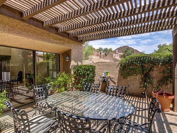 Fabulous Camelback Corridor Town home. This home has just been extensively remodeled and professionally designed. The kitchen features upgraded cabinetry, granite counters, and stainless steel appliances. This is a split floor plan with master bedroom on the back with extra bedroom towards the front. There is a beautiful media room in between. The entire home is perfect and move in ready. The rear yard is spacious and private with a covered patio and views of Camelback Mountain. This gated community features several tennis court areas with pool and spa. This is a end unit facing East with really great natural light. It is in close proximity to great athletic club, restaurants, grocery stores, and other nice shopping.