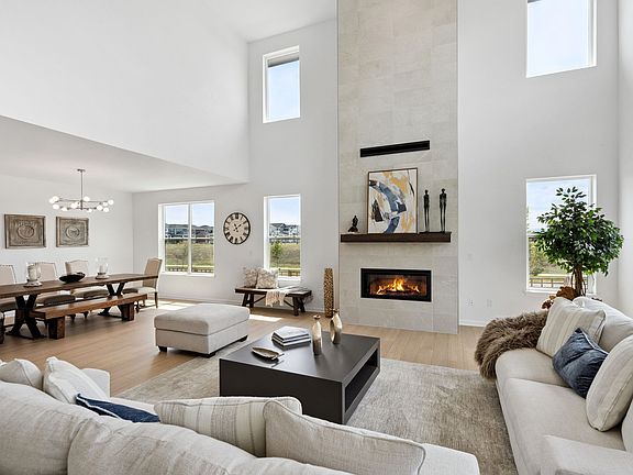 Expansive Two-Story Ceiling Great Room with sleek gas fireplace, and stylish dining space