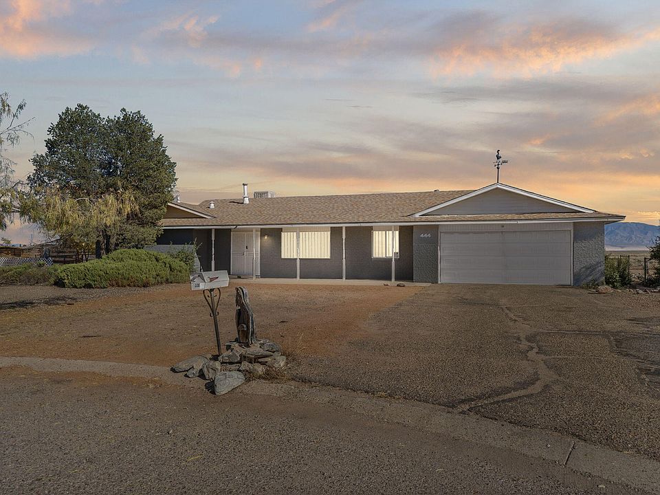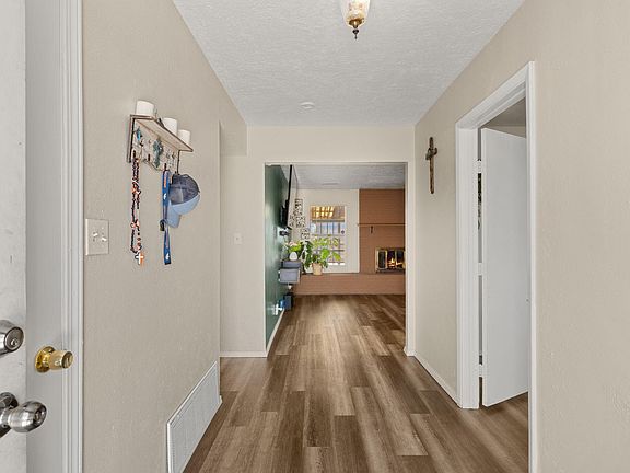 This inviting home offers three bedrooms and a dedicated office, providing space for work, study, or hobbies. Gather in two dining areas, one featuring a bright bay window, or relax in the living space by the wood-burning fireplace with brick accents. Ceiling fans throughout keep the home comfortable year-round, while a mix of carpet and vinyl flooring adds practicality. The primary suite includes a double-sink vanity, complemented by a barn-door-enclosed shower area for added privacy. Wrought iron details enhance the exterior, and the spacious yard with backyard access is perfect for entertaining or enjoying the stunning mountain views. Comfortable, versatile, and full of possibilities. Welcome Home!