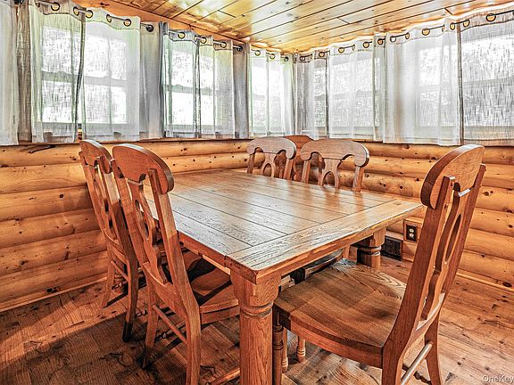 Inside, the spacious living and dining area showcases a striking stone fireplace with a barn beam mantle, ideal for cozy evenings. The kitchen is thoughtfully designed with wood cabinetry, soapstone countertops, backsplash, and an authentic farmhouse sink. Enjoy serene views while dining in the bright eat-in kitchen.