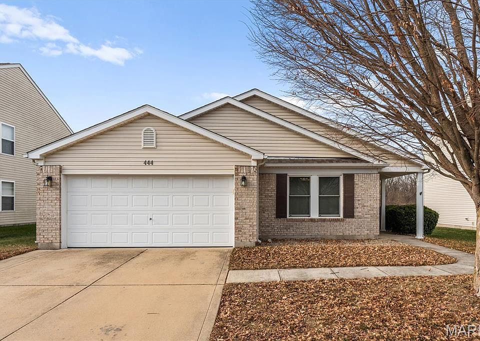 Step into the new year with a new home in Mascoutah!! Looking for a one story with open floor plan and great location? 444 Falling Leaf Way is a 3 bedroom, 2 bathroom home with modern features and open floor plan in top rated Mascoutah Schools! Luxury vinyl tile throughout the foyer, bonus room, kitchen, dining and living room! Split bedroom concept with spare bedrooms and large full bath separate from primary bedroom. Spacious kitchen with plenty of cabinets and countertop space, stainless appliances and open floor plan to ample size living room with gas fireplace. Attached dining area with convenient access to private and fence backyard, backing to woods/trees and easy access to the walking trail Primary suite includes a huge walk-in closet, double sinks and separate shower/tub combo and tiled floor. Some additional features include tankless water heater and radon mitigation system! Close to SAFB, I-64, shopping/dining. High School and Scheve Park are blocks away!