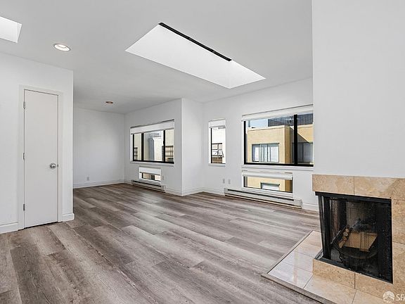 Top Floor 1 bedroom, 1 bath, condo with 1 car garage parking and 1 secure storage in a 15-unit elevator building. The home features a decorative fireplace, NEW paint, NEW hardwood floors throughout, and 5 skylights. Generous closet space in bedroom, along with linen and coat closets. Access to shared roof deck with views of Coit Tower, Downtown & Golden Gate Bridge. Free common laundry on the 1st floor. 1 block to Trader Joe's, Safeway & Post Office. Close to Washington Square Park, Financial District, Embarcadero, Aquatic Park & Pier 39. Perfect as a pied-a-terre or entry level home! Walk Score of 98 - Walker's Paradise! On-site Parking avail for an additional $300/mo. Move in date is December 5.