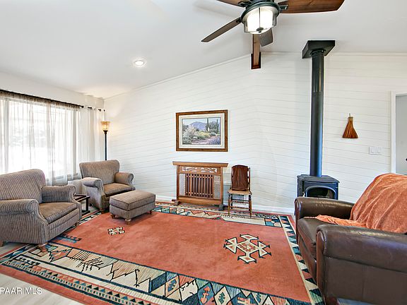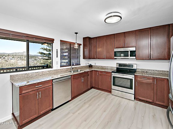 Nestled in downtown Prescott, this charming residence beckons with the promise of an in-law suite or Airbnb opportunity, all while showcasing unparalleled views of Thumb Butte and Granite Mountain. Enjoy a leisurely stroll to the town square from this welcoming home. Step inside to an open living area drenched in natural light, perfect for hosting gatherings. Cozy up by the gas stove, providing both warmth and ambiance. The updated kitchen boasts stainless steel appliances and sleek counters, catering to culinary enthusiasts. Retreat to the primary suite featuring a walk-in closet and built-ins for lots of storage. A hidden Murphy door adjoins to the family room with a tranquil window seat- ideal for unwinding with a good book.