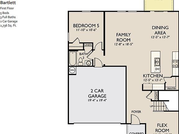Homesite #110 - "The Bartlett" - Create memories when you step inside the five-bedroom Bartlett plan. This two-story home features a versatile flex room off the foyer, a covered patio off the dining area, and a bedroom on the main level ideal for guests. The open, designer-curated kitchen overlooks the spacious living room and features professional curated design finishes. Here, you'll find gorgeous cabinetry, brushed nickel hardware, white quartz countertops, tile backsplash, and stainless appliances. On the second floor, a large loft area offers space for a media room, play room, or home office. The primary suite has a generous walk-in closet, tiled walk-in shower, and a dual vanity. Upgrades include tray ceiling in the owners suite, and a covered patio. Three secondary bedrooms, a full bathroom, and a laundry room with storage closet complete the second floor. Ask listing agent about current incentives. Photos are of the same floorplan on a different homesite. Design Choices may differ.