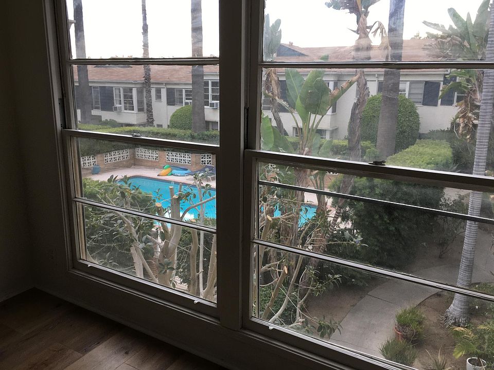 Newly Remodeled Upper Unit with hardwood floors, and a brand new bathroom. Pool, laundry on site, quiet neighborhood, stove, controlled access building, Wall Heater. Large apartments 750 sf + in attractive older well maintained Non Smoking building. This property has a gorgeous center courtyard, beautiful gardens and large pool. Short walk to health food store, full service Supermarket and over two dozen restaurants. The apartments are charming and have their original look and feel. There is a WAITING LIST FOR Parking. When parking is available it is $60.00 a month. Paid Utilities: Water & Trash, Gardener & Pool service. No Smoking allowed