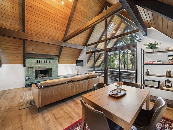 Escape to this stunning A-frame cabin on the Southfork of the Snoqualmie River, just 35 mins from Seattle! This classic PNW retreat features soaring beam ceilings, a cozy wood-burning fireplace, and floor-to-ceiling windows with river views. The bright sunroom offers wrap-around bench seating for indoor/outdoor entertaining. With 2 beds, 1.5 baths, ample storage, hot tub, fire pit, and a 15x16 shop, this home blends comfort and adventure. Enjoy direct river access, a new roof, electrical panel, septic, and lush landscaping. Close to skiing, trails, I-90 & downtown North Bend!