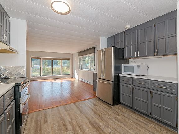 Discover affordable, easy living in this freshly updated manufactured home, nestled at the end of a quiet no-thru road in a peaceful rural setting. Featuring a desirable two-bedroom layout, the home offers a spacious open-concept living, dining, and kitchen area with hardwood flooring in the living room and stylish stainless steel appliances including stove, fridge, washer, and dryer. Recent upgrades include all-new paint and flooring, newer blinds, and a brand-new sliding glass door with built-in blinds that opens onto a large deck—perfect for relaxing or entertaining. With plenty of parking, low annual taxes, and a park fee of just $250/month, this property is as budget friendly as it is charming. Located in a pet-friendly mobile home park within walking distance to the Eagle River and offering quick access to the Trans-Canada Highway, it’s ideal for those seeking convenience and tranquility. Vacant and move-in ready, this home was recently placed on its lot—just bring your belongings and start enjoying.