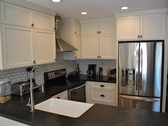 ~ Newer kitchen with SS appliances, range hood, dishwasher, farmhouse sink and matte black soapstone countertops.