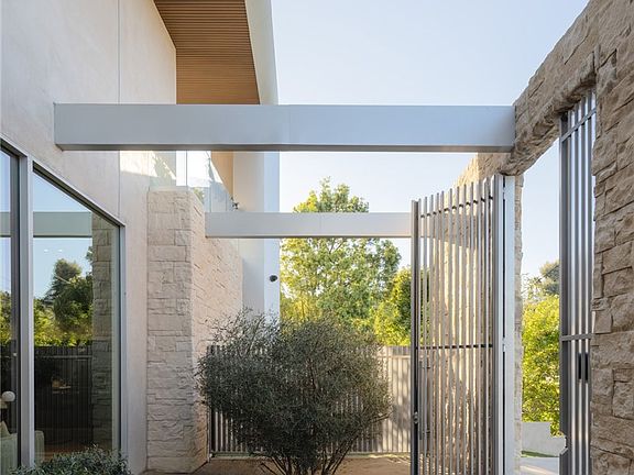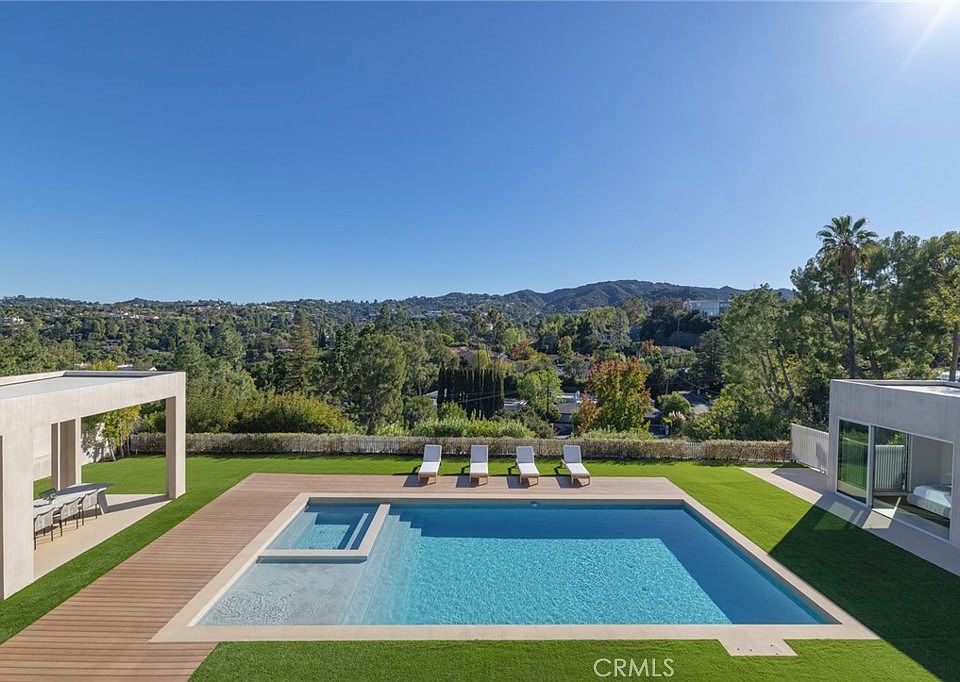 Perched in the coveted Encino Hills, this newly built architectural gem, designed by Dorothy Macik and architect Eran Gispan, blends modern design with organic serenity, framed by sweeping panoramic views. A grand pivoting glass door welcomes you into a world of refined luxury, where wide-plank white oak floors flow seamlessly, complemented by bespoke gray-smoke cabinetry. The gourmet kitchen is a masterpiece, featuring Quartzite countertops, honed marble finishes, Watermark fixtures, and custom cabinetry. Designed for effortless entertaining, the open-concept living spaces are anchored by a dramatic dual-sided fireplace, flanked by hand-forged steel shelving with smoke-tinted mirrors. Velvet wallpaper adds tactile luxury, while Fleetwood sliding doors dissolve indoor-outdoor boundaries. Ascend the floating staircase to four lavish en-suite bedrooms, each a private sanctuary. The primary suite offers a patio balcony with breathtaking views, a cozy fireplace, and a spa-inspired bath clad in travertine stone, complete with dual vanities, a soaking tub, and a glass-enclosed shower. A cinema-worthy movie theater ensures an immersive entertainment experience. The backyard epitomizes California living with a sparkling pool and spa, outdoor BBQ kitchen, and sports court, all set against the stunning unobstructed view of a hillside backdrop. A versatile ADU includes a gym and a bedroom—ideal for guests or extended stays. Additional highlights include a powder room with a handmade stone sink, modern drywall detailing, and Allied Maker light fixtures. Fully equipped with an automated smart home system and state-of-the-art sound, this estate offers unparalleled convenience and ambiance. Moments from Ventura Blvd, it’s a rare fusion of luxury, tranquility, and urban accessibility.