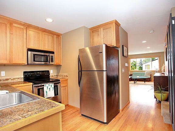 Not your average townhome! Big rooms, great views, only one attached neighbor. Newer appliances, hardwood floors, fresh paint throughout. Kitchen opens to lovely garden patio with custom arbor. Private baths in both bedrooms, plus one for guests downstairs. HUGE ground-floor bonus room perfect for home office and/or mega-den. Plenty of storage and dedicated parking. Prime location in heart of West Seattle, steps from Alaska Junction shops, nightlife and transit.