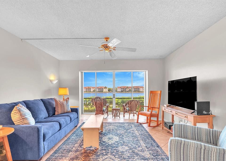 Winter Paradise awaits you **DIRECTLY ACROSS THE STREET FROM THE OCEAN** is this GATED, fully furnished, wonderful, clean, turnkey, first floor lake view 2/2 condo with screened in private lanai. Amenities include a stocked 7 acre fresh water lake for fishing, two hard surface lighted tennis courts, bocce, shuffleboard, heated swimming pool, adjacent spa and community clubhouse. In the heart of the Island this location offers fabulous restaurants, shopping, and beautiful beaches. Cable is included. Free WIFI is available in the Unit and at the clubhouse along with flat screen HD TV for our community enjoyment. The active social calendar boasts activities for everyone.