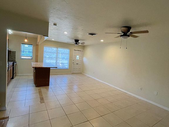 Custom eat-at islandFresh paintNew ceilingsOpen floor planCeiling fansWall to wall tileWooden cabinets