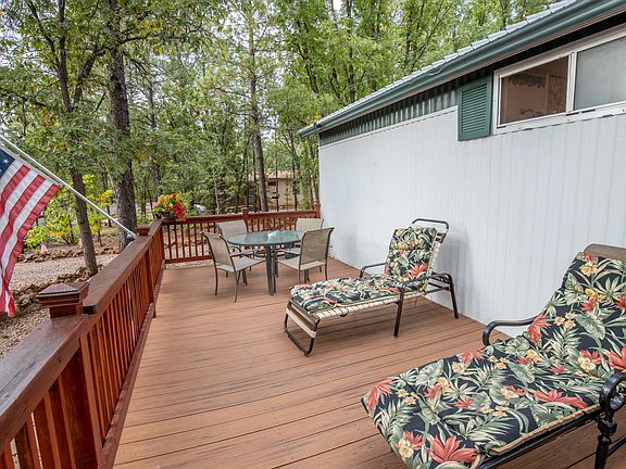 Well maintained home situated on large lot backing the reservation railroad easement. Being sold furnished. Open space with tall trees all round this small mobile home. Large new front trex deck and cozy covered private back deck. Inside features comfortable dining and kitchen and living room areas. There is one bedroom and bath along with an additional room that is currently used as a sleeping room and could be an office or den or whatever you choose. Heat is forced air gas. You must see this beautiful park like setting. Two out buildings with power. HOA is only $40 per year. Natural gas is in the street but not in the house.
