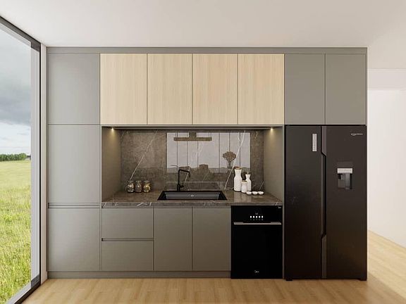 Modern architectureModern pivot entry doorHigh ceilingsRefined finishesLarge waterfall islandPrivate terraceOpen-concept layout