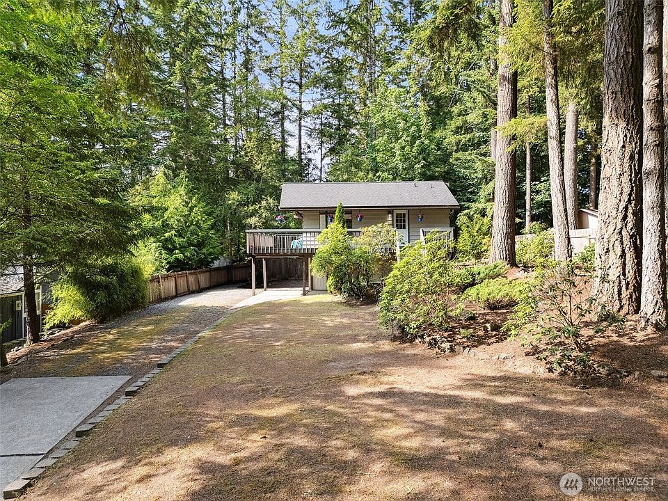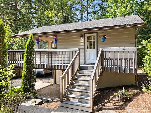 Enjoy the best of both worlds serene cabin-in-the-woods charm with the convenience of nearby amenities, including the ferry and Hwy 16. Nestled on a beautifully landscaped lot near Long Lake, this property even includes community beach access. Inside, you’ll find an updated kitchen, vaulted ceilings, a cozy wood-burning fireplace, and durable laminate flooring. All appliances are included for a move-in ready experience. Step outside to a spacious deck perfect for entertaining, plus a 10x10 attached storage room and an additional covered storage area out back. Proof that great things really do come in small packages!