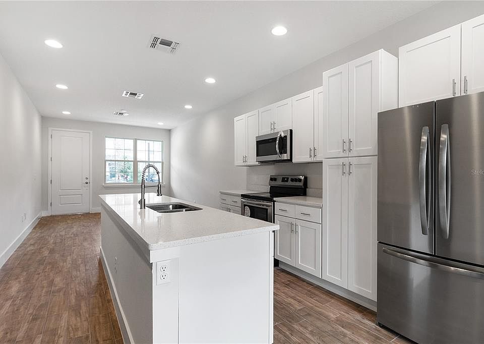 The home was built with many upgrades: quartz countertops in kitchen and bathrooms, designer cabinets, stainless steel appliances, tiles throughout bottom floor and all bathrooms, quality vinyl flooring in bedrooms and NO CARPET anywhere.