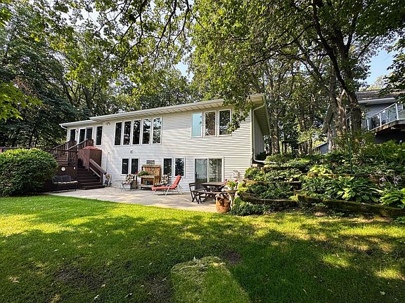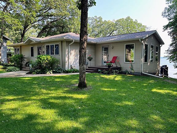 BIG PINE LAKE! Well-maintained year-round lake home on the west side. The main level features a spacious kitchen island, large lakeside windows for beautiful views, Owner's suite with private bath and a cozy 16'x16' sunroom with door to deck. The lower level includes a family room with a door to the patio, 2 bedrooms and bath. High efficiency furnace, central air and gas fireplace. 4" drilled well and certified septic system. Detached 2-stall garage. 40' roll-in dock included. Blacktop road past property. Good swimming and fishing!