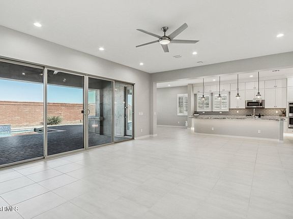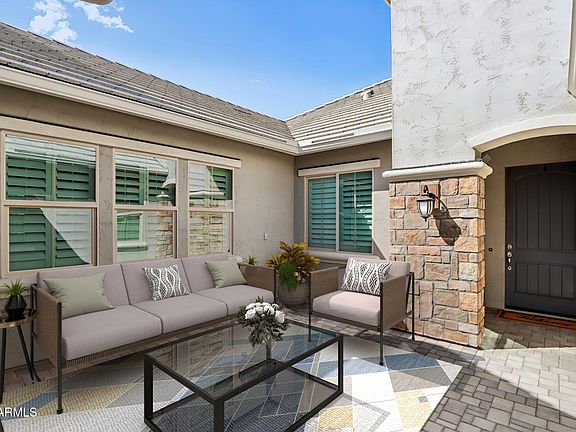 Buyer will receive a lender credit of 1% applied at closing if they utilize the seller's preferred lender for financing. This stunning single-story home boasts of 5 spacious bedrooms, office/den & 4 full bathrooms, all set on a premium lot with N/S exposure, no neighbors behind & the Cooley Station ''red brick'' exterior wall. As you enter through the private courtyard, you're welcomed by an open-concept layout w/ soaring 10-ft ceilings, recessed LED lighting, great room & a versatile dining area that can serve as an additional living space. The gourmet kitchen is a chef's dream, featuring an oversized island with breakfast bar seating, granite countertops, walk in pantry & ceiling height white shaker cabinets with elegant under-cabinet lighting on both the upper/lower cabinets & the kitchen island. The primary suite is your personal retreat featuring an on-suite bath with dual sinks, soaking tub, walk in shower & a spacious walk-in closet. The home is complemented with the luxury of porcelain tile flooring, farmhouse shutters, full home security security system, water softener, Honeywell electronic air filters & indoor-outdoor living is at its finest featuring a 16-foot Atrium sliding glass doors that open up to the covered patio & backyard oasis, complete with a sparkling pebble tec pool, built-in gas firepit, & BBQ gas grillideal for both relaxing & entertaining.