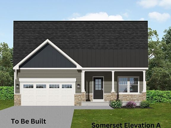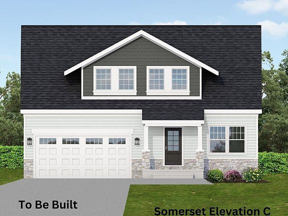 Floor plan B offers dedicated office space or flex room. The Somerset model boasts sloped 12 foot ceilings in the great room and dinette area, enlarging your take on the space. You can add an optional covered porch. The garage entry offers an optional bench and an ample storage closet. A 2nd floor can be added with an additional bedroom or two and a full bathroom. Three exterior elevations are available with varying roof lines and a full covered front porch or covered stoop.  All include minimal maintenance vinyl lap, with a combination of board and batten and/or shake siding and stone veneer on front.