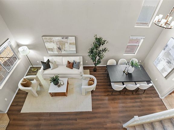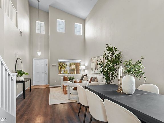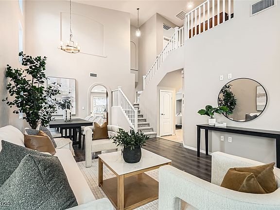 Live Brilliantly, stunning, sunlit 3 bedroom 3 bath home, nestled in one of Las Vegas's most desirable gated neighborhoods. This upgraded retreat offers over 2200 sq ft of flexible living space, featuring soaring ceilings, a modern open-concept kitchen, and a backyard private oasis with covered patio, low maintenance landscaping, mature trees, privacy, and is perfect for entertaining. Enjoy luxury vinal plank flooring, updated lighting, plush new carpeting, and a huge primary suite with dual sinks, garden soaking tub, separate shower and walk in closet. Home is ideally located near Craig Ranch Regional Park, major shopping, Nellis AFB-This home offers comfort, convenience, and an unbeatable value. Whether you are upsizing, investing, or buying your forever home, this North Las Vegas beauty checks all the boxes. Professionally staged by Utopia.