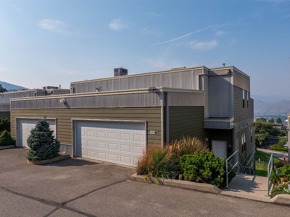 Rare Opportunity at Rivers Vista! Experience elegant top-floor living in this exceptional downtown residence, complete with a rare double garage. This bright 3-bedroom, 3-bathroom home offers over 1,700 sq. ft. of thoughtfully designed space across two levels, featuring tasteful hardwood floors and low-maintenance living with remarkable city views. The main level boasts soaring 10 ft ceilings, a welcoming foyer, laundry room, versatile bedroom/office, full bathroom, and a spacious open-concept living area. Expansive north-facing windows flood the space with natural light while capturing breathtaking views of the city skyline. The gourmet island kitchen is a showpiece with top-of-the-line appliances, granite countertops, solid white cabinetry, marble backsplash, and a breakfast bar—perfect for entertaining. Upstairs, the luxurious primary suite offers a walk-in closet, cozy reading nook, private sun deck, and a spa-inspired ensuite complete with soaker tub, heated tile floors, and separate shower. A second bedroom on this level also features its own full ensuite for ultimate comfort and privacy. Located minutes from Sahali shopping, RIH, and TRU. Pets and rentals are welcome. All measurements approximate.