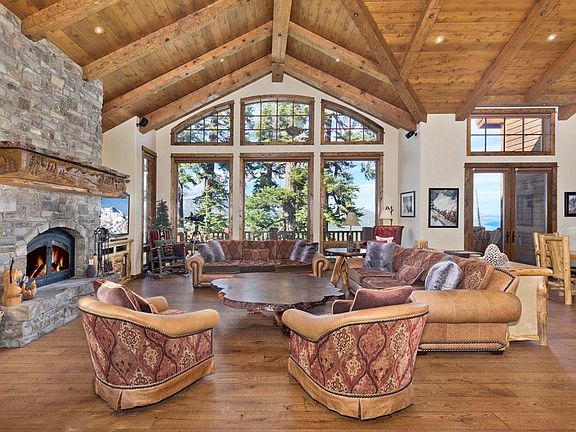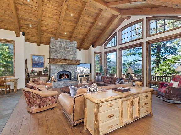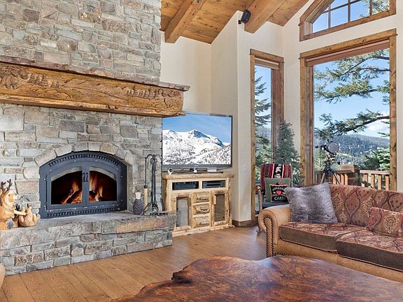 Welcome to 445 Fir Street, an extraordinary custom home nestled in the prestigious Bluffs neighborhood of Mammoth Lakes. This stunning mountain retreat perfectly captures the essence of high-altitude living, with panoramic views, refined craftsmanship, and a serene setting among old-growth trees. One of the largest lots in the Bluffs, this unique property offers exceptional privacy and space. The neighboring lot was previously subdivided and incorporated into the adjacent property, ensuring that no future construction can occur next door. This rare situation enhances both the exclusivity and tranquility of the setting offering peace of mind and uninterrupted views. Step inside to find a fully remodeled chef’s kitchen featuring quartz countertops, a 6-burner Viking range, stainless steel appliances, and a walk-in pantry. The heart of the home flows effortlessly into the impressive great room, where floor-to-ceiling windows frame breathtaking mountain views and soaring hand-hewn beams crown the vaulted ceilings. A dramatic stone fireplace with a hand-carved mantel adds warmth and rustic elegance to the space. Wide-plank hardwood floors flow throughout the home, enhancing the cozy yet sophisticated mountain lodge feel. The spacious primary suite is a true sanctuary, complete with a custom gas fireplace and picture-perfect views of Mammoth Rock. The spa-like bathroom includes a soaking tub positioned to take in sweeping views above the treetops, one of the best vantage points in the house. Outdoor living is just as exceptional. Unwind in the hot tub on the deck while enjoying forest and mountain views, or gather around the built-in stone firepit and seating area for unforgettable evenings under the stars. With expansive decks and a beautifully designed outdoor space, entertaining is effortless in every season. Beautifully crafted and thoughtfully designed, 445 Fir Street is the ideal basecamp for your Mammoth adventures.