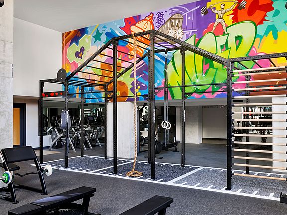 State-of-the-art fitness center with double-height ceiling and Cross-fit style equipment
