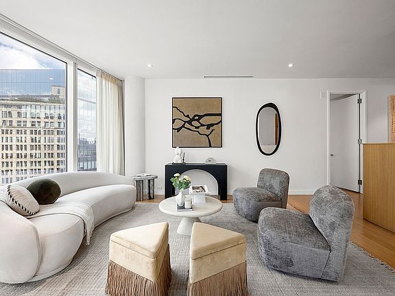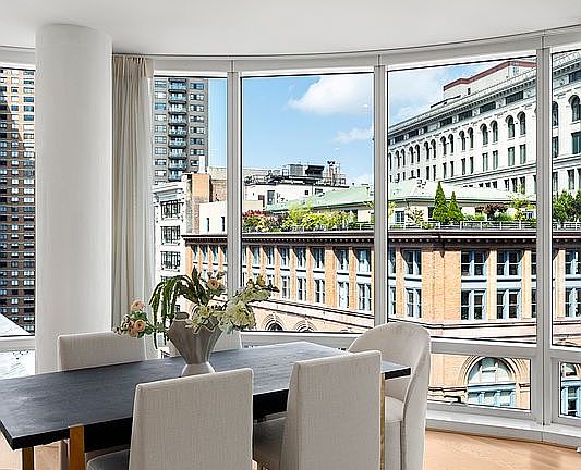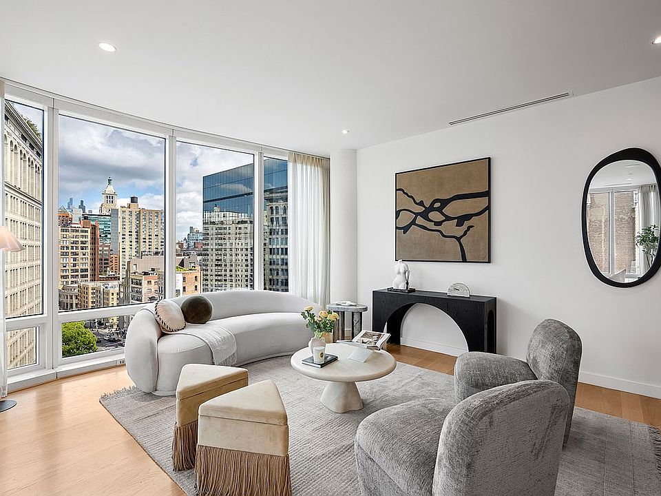 Beneath an undulating facade of floor-to-ceiling windows with northern, eastern and western exposures lie spacious, customized interiors spanning over 1,400 square feet. Beautiful wide-plank white oak floors, central heating and cooling, and recessed lighting run throughout, while open city vistas lend the home a light, clean, and airy aesthetic. All of it is mere moments from Washington Square Park, Union Square, the East Village, Nolita, SoHo, and the Lower East Side.
