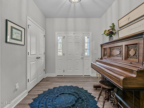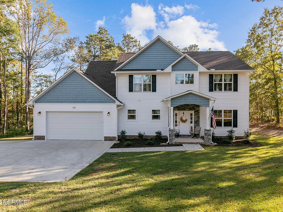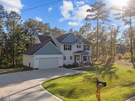 Tucked peacefully in the pines, this gorgeous home sits on serene two-half-acre lots. The crisp, white cabinetry paired with luxury granite countertops brightens this home's gourmet kitchen and the oversized 8' island makes entertaining effortless. The kitchen opens to the great room with a decorative fireplace and a custom-built accent wall. French doors lead to the cozy covered deck with a built-in gate, perfect for enjoying quiet moments and watching wildlife in your backyard. The office features built-in bookshelves. A newly added utility table in the laundry room and a beautifully built bench in the mudroom bring efficiency to the space. Upstairs are four spacious bedrooms with walk-in closets and two full bathrooms. Large windows in the bedrooms make them feel bright and airy. Half bath downstairs. Soft-close cabinets and drawers and child-proofing all throughout the home. Two-car garage and long driveway. Two-half-acre lots will be merged at closing to make 1-acre.