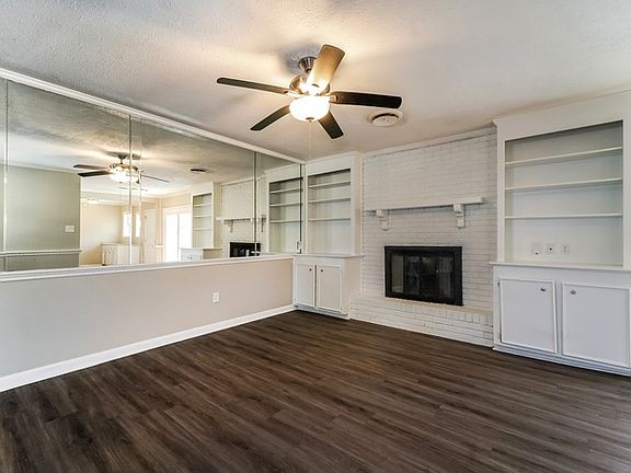 Inside, the floor plan offers plenty of room for comfortable living. The living area features luxury vinyl plank flooring, a brick mantle, and custom-built shelvingbringing warmth and functionality to a space well-suited for both relaxing and entertaining.