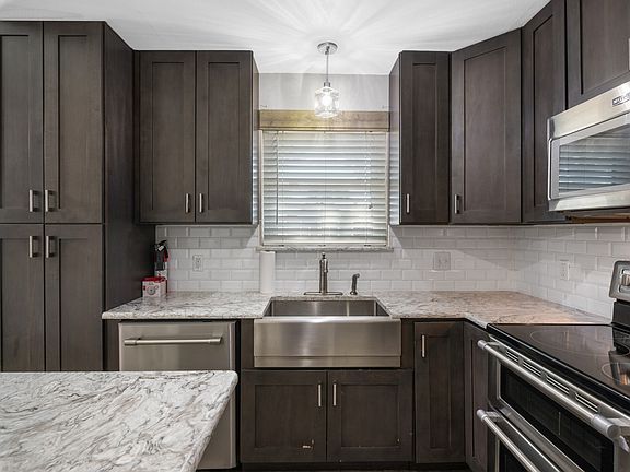 Wood burning fireplaceModern stainless appliancesOutdoor storage buildingNewer air conditionerNewer windowsBeautiful stone countersCovered patio
