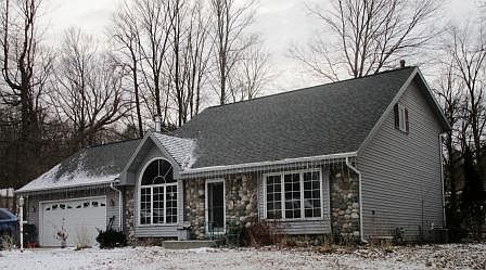 Great 1.5 story in sleepy little neighborhood convenient to the interstate, yet country living with private mature corner lot. Open concept great room with stand alone wood stove and volume ceiling. Kitchen with ceramic tile, stainless steel appliances and dinette with patio doors to backyard. Upper level family room loft looks over the great room and is just off the master suite.Large walk in closet and updated master bath complete the upper level. Lower level is finished with a wet bar and office/flex room. A newer roof and garage door complete this modern contemporary home. Needs some TLC!