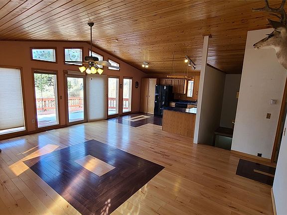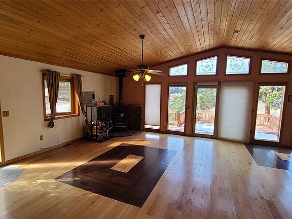 Comfortable mountain contemporary.  Views of Mount Rosalie,  Easy commute with quick access back to 285. Main floor has beautiful wood floors with custom inlays.  Large lower room that could be Primary suite with it's own bath or a second living area. Was previously used as a lock off rental..  Enjoy the large deck for all your entertaining.  The kitchen has room for a dining table.  Wood burning stove in the main living room.
