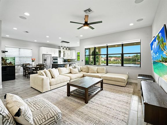 Enjoy serene water views from both the front and backyard of this Executive Series home—your own private oasis. This beautifully maintained 4-bedroom, 2.5-bath residence with a 2-car garage offers an open-concept layout with tile flooring throughout all main living areas, high-volume ceilings, and pre-wired surround sound in the living room for an open, bright, and inviting feel. The spacious kitchen features stainless steel appliances, a walk-in pantry, and a professional range hood. Step outside to an extended patio ideal for outdoor dining, grilling, and entertaining. Additional features include impact windows and doors, a Tesla-ready charger outlet in the garage, and generous storage throughout. Located in Raintree, a premier gated community offering resort-style amenities including a swimming pool, lounge area, children’s playground, clubhouse, and multipurpose room. HOA includes lawn care, sprinkler maintenance, and mulching for added convenience.