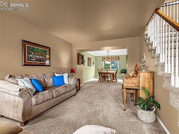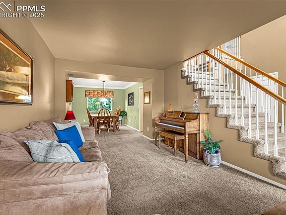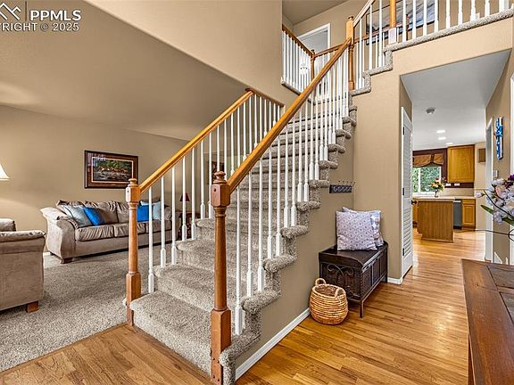 Welcome to the heart of Jackson Creek! This beautifully maintained and thoughtfully updated 5-bedroom, 4-bath home offers over 3,200 sq ft of comfortable living space, including a fully finished walkout basement. From the moment you arrive, you’ll notice the inviting curb appeal, with stone accents, an oversized 2-car garage with a utility sink and workbench, and a spacious front porch where you can enjoy mountain views. Inside, the flowing floor plan features a generous formal dining room and living room, perfect for entertaining. The kitchen opens to the great room with a cozy fireplace, creating a warm, welcoming atmosphere. Upstairs, the primary suite offers a private retreat, while additional bedrooms provide ample space for family, guests, or a home office. The Master Suite is a stunner! It features a 5 piece bath with jetted tub, as well as his and hers walk-in closets! The fully finished walkout basement includes a large rec room, bedroom, and full bath—ideal for multi-generational living or a guest suite. The Rec Room offers built in cabinetry, a tile clad gas fireplace, as well as an entertainment cubby. Step outside to your own private backyard oasis, complete with mature trees for privacy, a large composite deck, a fire pit area, and plenty of space to relax or entertain. Situated on a private 6,800 sq ft lot, this home combines comfort, functionality, and style. Located in a sought-after Jackson Creek, offering award winning D38 Schools, and a community park just steps away, offers the perfect balance of convenience and tranquility. Welcome Home!