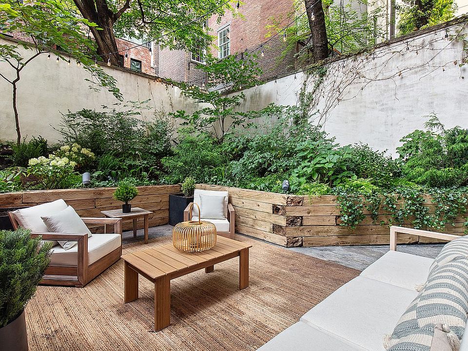 The main floor features a bright, open living and dining area with oversized windows and a sleek modern kitchen. Step outside to your extraordinary 750 sq ft private garden terrace — a true urban oasis. Perfect for entertaining, dining al fresco, or simply unwinding, the terrace provides space rarely found in Manhattan.