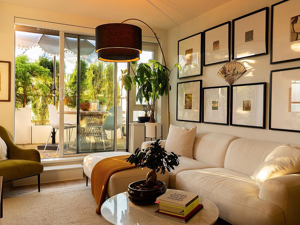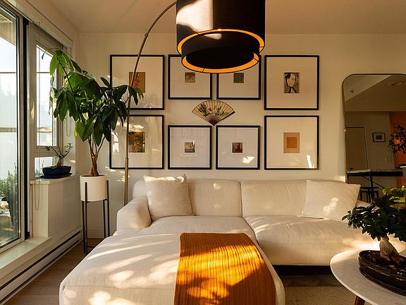 A statement in thoughtful design and quiet luxury - this reimagined one bedroom, flex, and den at The Maynards Block is a bespoke retreat in the city. Every element has been elevated: designer wallpaper, sculptural lighting, a gracefully arched frame defining the flex space, and curated CB2 planters that soften the terrace edge. Evening light spills across wide-plank floors, and through floor-to-ceiling glass from a sunlit 197-sq-ft balcony made for calm moments in the heart of the city. Steps from the seawall and perfectly poised between Olympic Village and False Creek, a chef’s kitchen, custom upgrades, and a layout that flows as naturally as it is refined make this home a convergence of architecture, art, and atmosphere - for those who find beauty in detail and meaning in design.