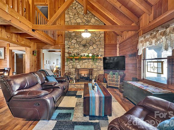 Inside, the home showcases 3 bedrooms + bonus, 3 bath with a dramatic vaulted ceiling and a striking rock fireplace that anchors the main living space, creating a warm and inviting atmosphere. The layout enhances the cabin’s rustic charm while allowing for comfortable everyday living and entertaining.