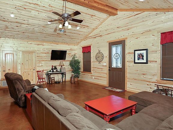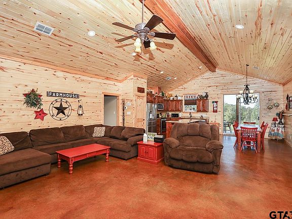 Escape to the country and enjoy your own outdoor paradise! Hunt, fish, play disc golf, ride the land, watch the wildlife or the astonishing sunsets and more. Stunning 4/3 Ranch style home with approx. 2058 sq ft on approx 80 +/- acres (to be surveyed). Gorgeous land with springs, creek, 18 hole professional disc golf course designed by John Houck, stocked catfish pond, pasture and partially mixed wooded areas. 14' vaulted Great Room adorned with wood planks. Granite countertops, large island and ample cabinetry in the kitchen with eat at breakfast bar. Kitchen dining combo with covered patio access. Three spacious guest rooms for large family needs or for overnight guests. Generously sized primary bedroom with covered patio access. Well sized primary bath with double vanity, walk-in shower and closet.Large utility and mud room. Entertain inside and out utilizing the outdoor kitchen and hot tub. Minutes from Lake Cypress Springs, Historic Mount Vernon and Winnsboro.