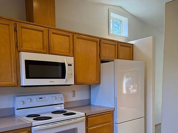 Fenced backyardCovered patioDouble car garageVaulted ceilingsBuilt-in microwave