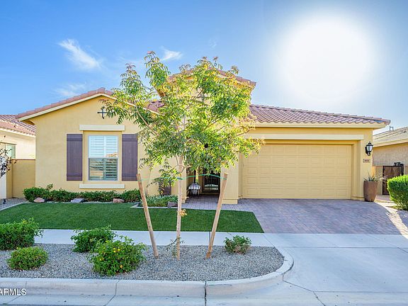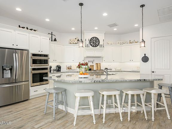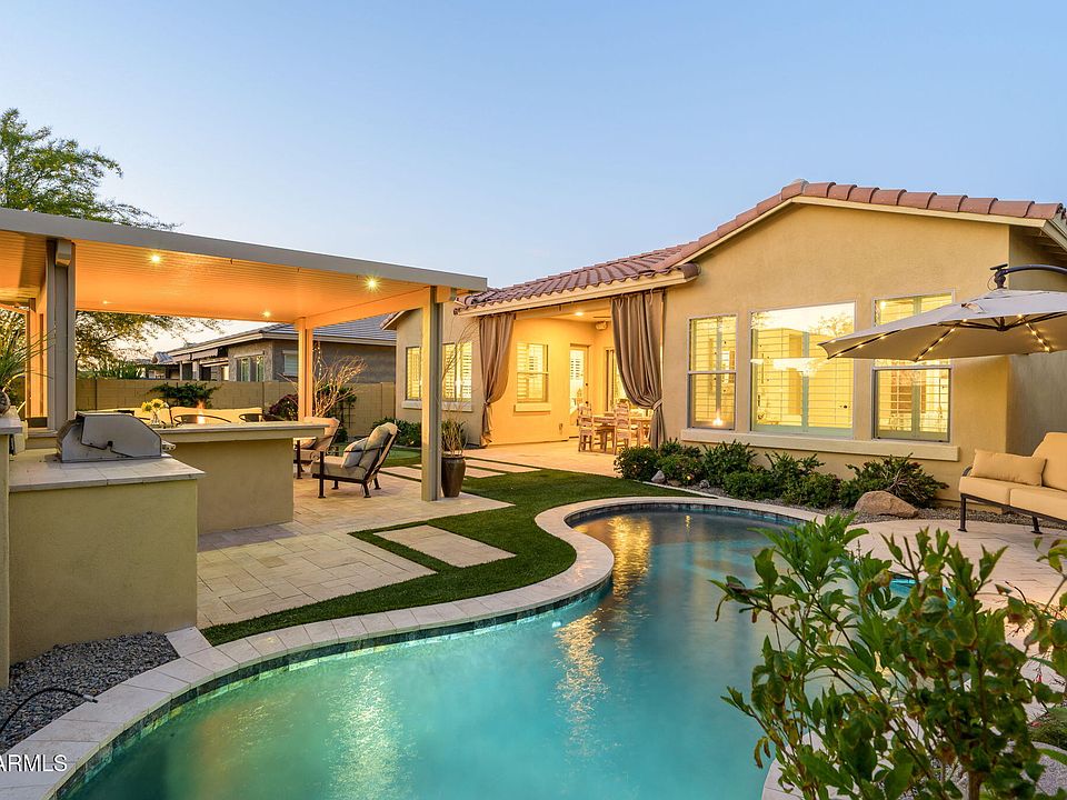 Stunning luxury home in Eastmark with approx. $155k in upgrades! The elegant interior features wood-plank-tile th/out. Bright white gourmet kitchen w/brick backsplash, convection micro-wave, quartz counters & island, gas cooktop, pot filler, custom cabinet encased hood, dbl. ovens, wine fridge, extended buffet. SUN ROOM w/french door. Reclaimed wood accents, faux wood beams, shutters, & surround sound. 8 ceiling fans th/out. New water softener & water heater. The backyard oasis; play pool w/misters, turf & landscape, built in BBQ & seating, putting green, pergola w/custom Gabion entertainment center, sunbrella drapes & travertine pavers. 3C garage w/epoxy floor. Premium lot across from neighborhood park. Gated community. This