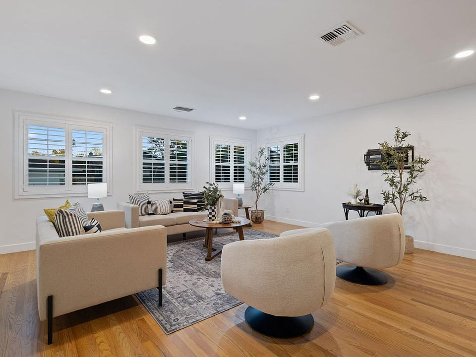 Inside, youll find smooth textured walls, refinished hardwood floors, and a seamless open layout that highlights the homes thoughtful design. The family room features a custom wood mantle, new fireplace surround, and expansive windows that fill the space with natural light. A sliding door leads to a covered deck overlooking a tropical-inspired backyard with a pool, waterfall, spa/hot tub - perfect for entertaining. The chefs kitchen showcases custom cabinetry, quartz countertops, high-end appliances, a gas range, built-in microwave, and a skylight that brightens the space. The primary suite offers a serene retreat with a custom closet system, LED mirror, and electric towel warmer. Both bathrooms are tastefully updated, and the laundry room includes extra storage and washer/dryer hookups. Modern upgrades include a whole house fan and new solar for the pool and pump. Every detail reflects quality and carea perfect blend of modern elegance and timeless charm. Truly move-in ready and even more beautiful in person!