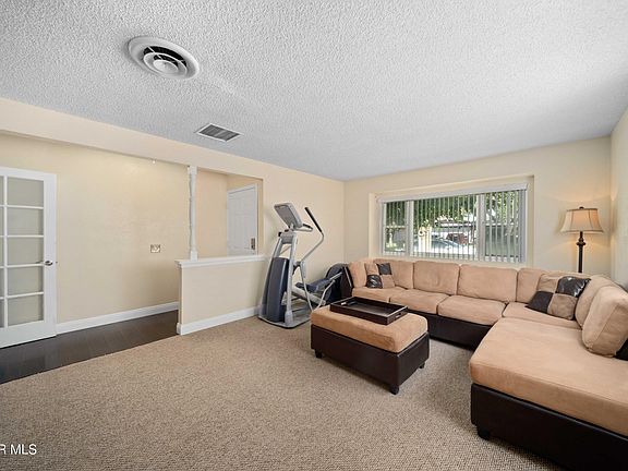 Two separate living rooms provide versatile spaces, one featuring a fireplace and sliding door access to the backyard. The rear yard is spacious and includes a covered patio ideal for outdoor dining or relaxation. Warm interior tones and excellent curb appeal create a welcoming atmosphere from the moment you arrive.