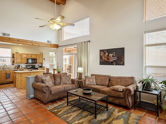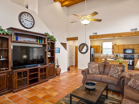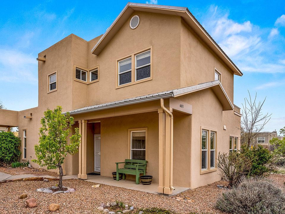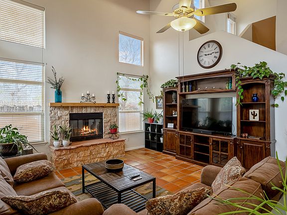 Located in the desirable Nava Ade subdivision, this two-story home is nicely situated overlooking open space on two sides. Every room is filled with natural light. Enjoy the open-concept living space with a wood-burning fireplace and a two-story high beamed ceiling. The large kitchen has updated black-stainless steel appliances and a generously sized island. There are two guest bedrooms with one full bath on the first floor. The large upstairs master suite has a walk-in closet, a full bath with double vanity, a separate shower, and a soaking tub. The upstairs landing opens onto a balcony with southwest views of the Sandia and Jemez mountains. There are several storage and coat closets in the home and an attached two-car garage. The outdoor spaces are inviting with mature trees and plantings, and a private fenced backyard. Steps away from the Nava Ade community center, which offers a pool, workout facility, sauna, and meeting space, with walking trails nearby.