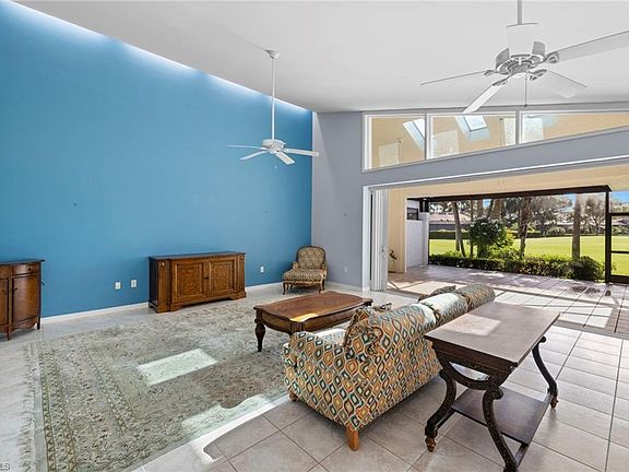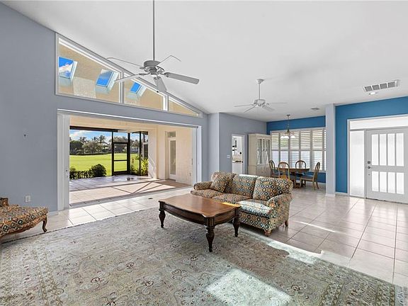 Large screened lanaiHeated poolHigh ceilingsGolf course viewsOpen layoutNatural lightTropical landscaping