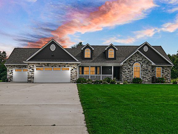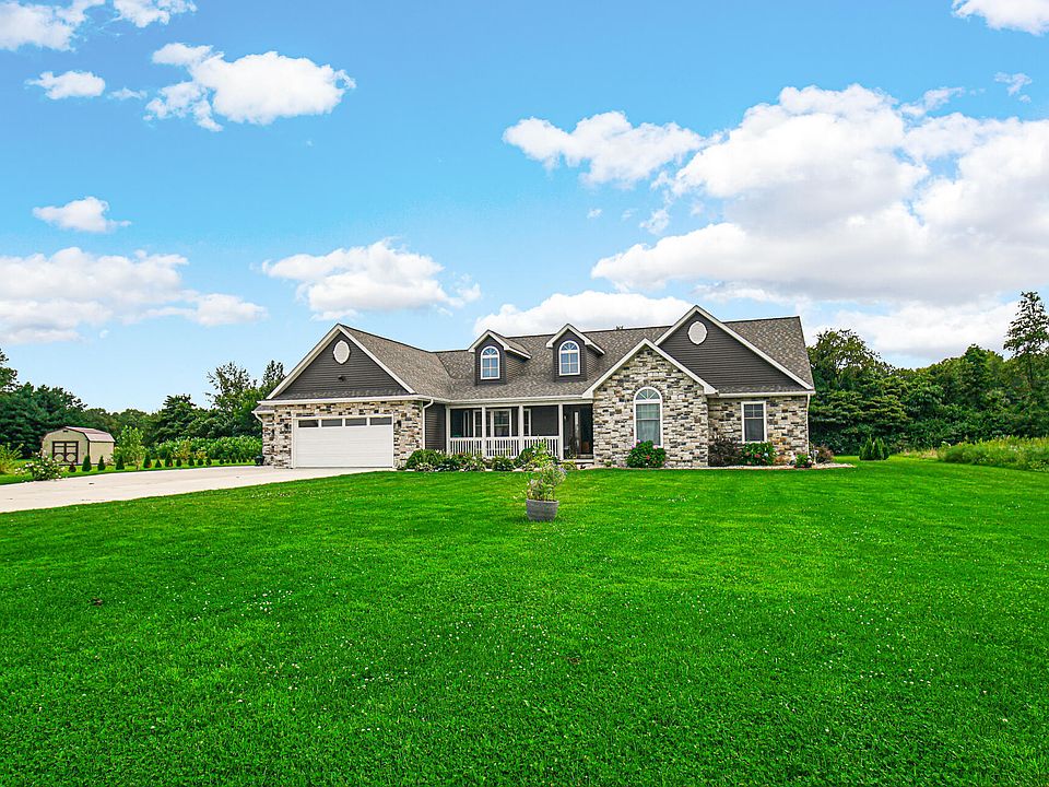 This stunning, 4-year-old home is nestled in the peaceful Prairie Ridge subdivision in Wheatfield, Indiana. With 4 spacious bedrooms and 2 1/2 baths, this home has been thoughtfully designed to offer modern living at its finest. The heart of the home is the striking great room, featuring vaulted ceilings that create a grand sense of space. The open-concept layout seamlessly connects the living area to the kitchen, making it perfect for both everyday living and entertaining. A beautiful stone fireplace adds warmth and elegance, while the custom kitchen is equipped with stylish cabinetry, granite countertops, and a two-toned gray 8-foot island. The stainless steel appliances complete the kitchen space. The master suite is a true retreat, offering a large private bath with a soaking tub and a custom glass-enclosed shower, designed to provide ultimate relaxation. Additional features a 3+ car garage that includes a unique pass-through garage, with ample storage space. Enjoy outdoor living on the covered porch and patio, with an above ground pool and a huge Trex Deck. The secluded backyard is tranquil making it perfect for relaxing or enjoying the wildlife. The home's curb appeal is enhanced by its stone front and low-maintenance vinyl siding. Set on a 1 acre lot, this home offers privacy and space while still being part of a lovely neighborhood. There is a sprinkler system with it's own well (2 wells on the property), additionally there is also a invisible fence surrounding the property for your pets. Property taxes reflect no exemptions. Don't miss out on this move-in-ready gem--schedule a tour today and make it your own!